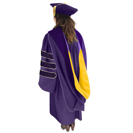 Each gown boasts bell sleeves adorned with three black velvet chevrons, paying homage to the timeless tradition of doctoral attire. Our doctoral hoods are meticulously designed to reflect the distinct achievements of all doctoral graduates, ensuring that you stand out on your special day.